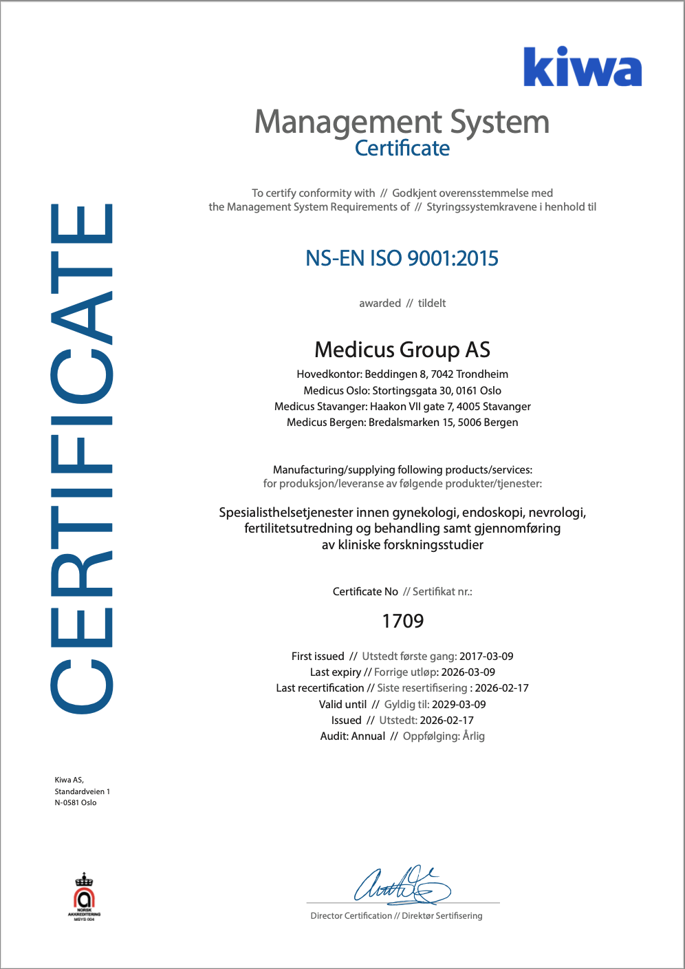 Ved Medicus jobber vi kontinuerlig med forbedring av våre tjenester og er sertifisert av Kiwa Teknologisk Institutt etter kvalitetsstandarden etter ISO 9001:2015.
