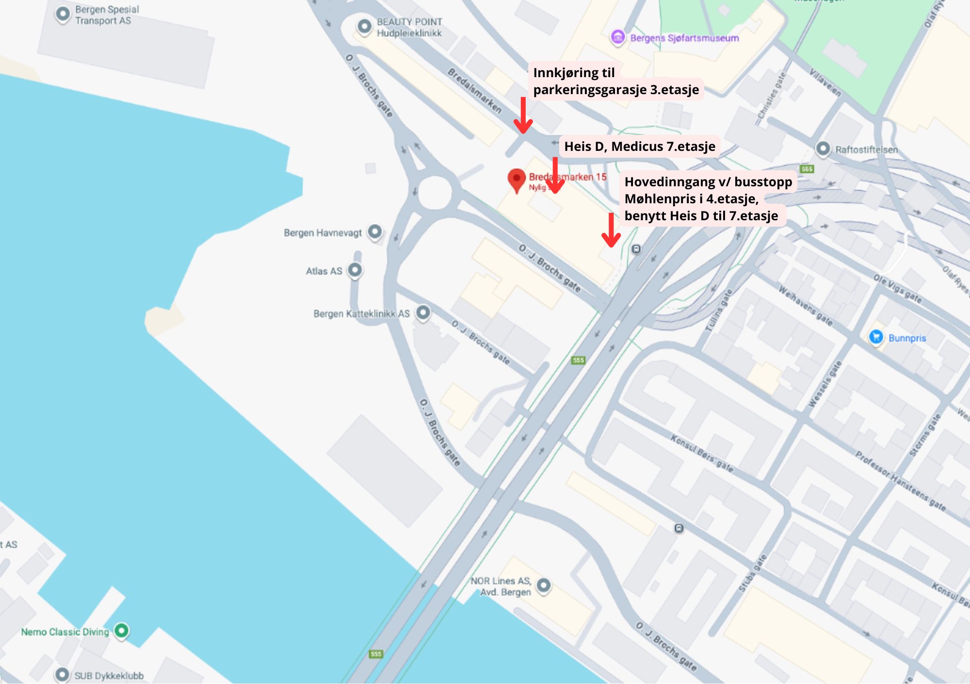 Innkjøring til parkeringsgarasje i 3.etasje. Her finner du også inngang 3D. Benytt Heis D opp til 7.etasje.